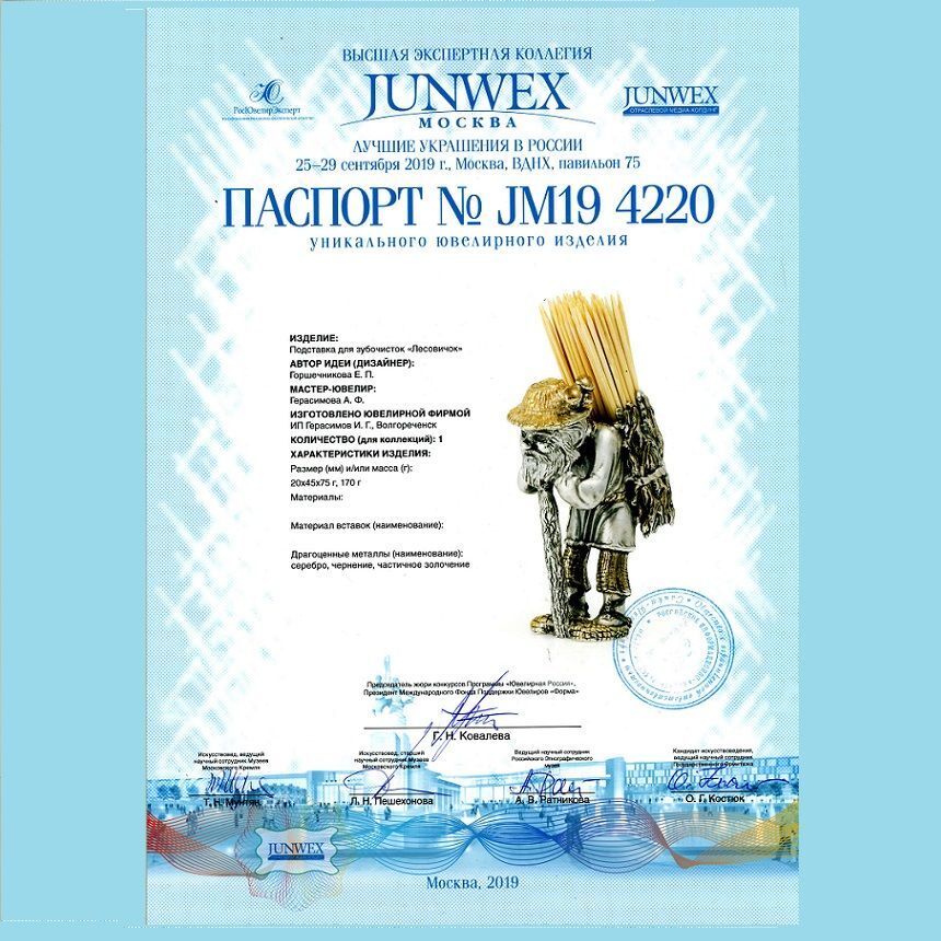 Изделие заняло призовое место на всеросийской ювелирной выставке JUNWEX 2019 г. Москва и имеет паспорт уникального ювелирного изделия.