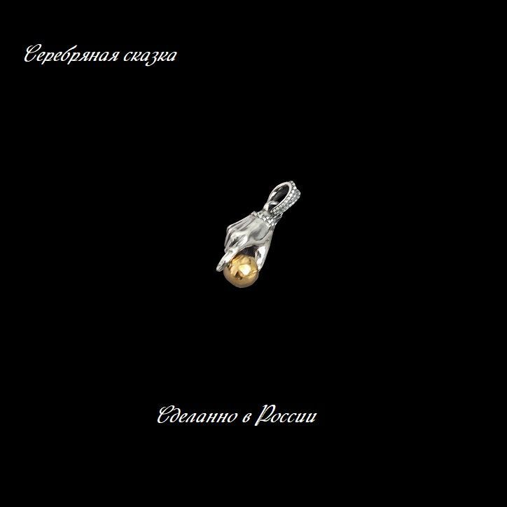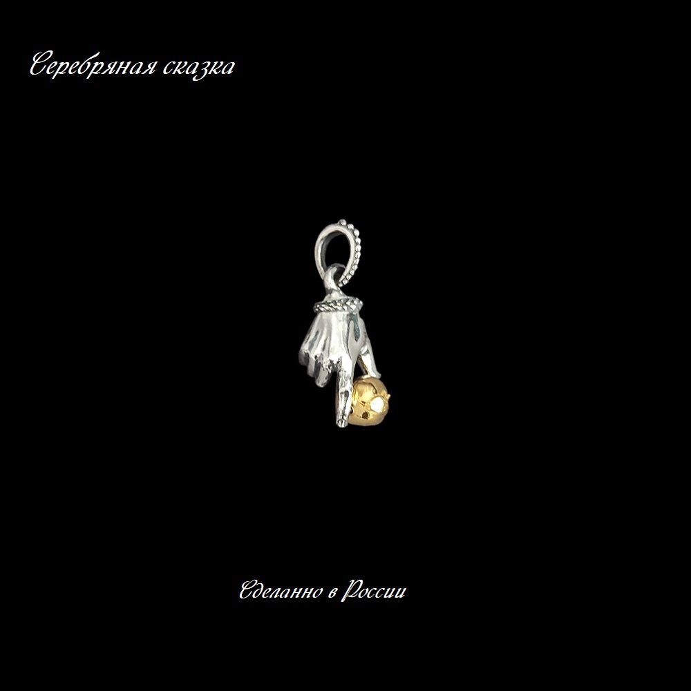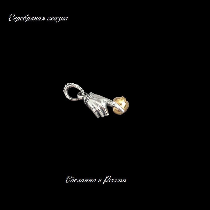 Подвеска из серебра 925 пробы в виде руки держащей золотое яблоко. Яблоко — древний символ жизни, вечной молодости и бессмертия. Благодаря своей почти идеальной шарообразной форме, оно символизирует целостность, бесконечность, вечность, обратимость, цикличность, совершенство.